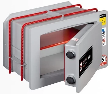 Надёжность сейфа обеспечивает массивная дверная панель из двух слоёв стали высокого качества, толщиной 10 мм, между которыми размещается защищённый от взлома и других видов силового воздействия замковый механизм, а также специальная ригельная система, гарантирующая крепкое запирание.
